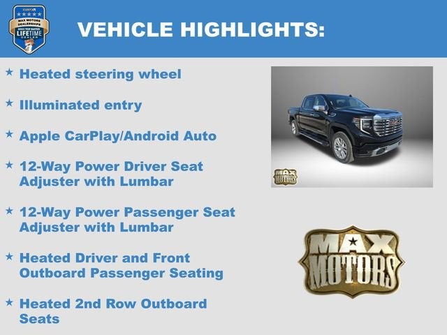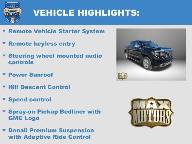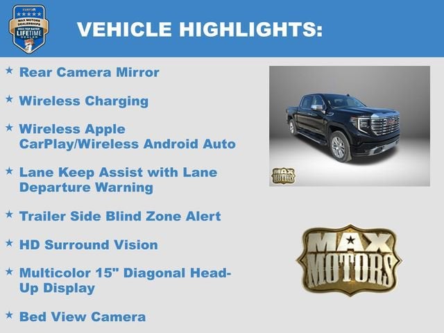 10-Speed Automatic, 4WD, Jet Black w/Leather-Appointed Seat Trim, 12-Way Power Driver Seat Adjuster with Lumbar, 12-Way Power Passenger Seat Adjuster with Lumbar, Apple CarPlay/Android Auto, Bed View Camera, Denali Premium Suspension with Adaptive Ride Control, HD Surround Vision, Heated 2nd Row Outboard Seats, Heated Driver and Front Outboard Passenger Seating, Heated steering wheel, Hill Descent Control, Hitch Guidance, Illuminated entry, in-Vehicle Trailering System App, Integrated Trailer Brake Controller, Lane Keep Assist with Lane Departure Warning, Multicolor 15 Diagonal Head-Up Display, Navigation System, Power Sunroof, Premium Bose 7-Speaker Sound System, Push Button Start, Rear Camera Mirror, Remote keyless entry, Remote Vehicle Starter System, Speed control, Spray-on Pickup Bedliner with GMC Logo, Steering wheel mounted audio controls, Technology Package, Trailer Side Blind Zone Alert, Trailering Package, Variably intermittent wipers, Ventilated Driver and Front Passenger Seats, Wheels: 20 x 9 Multi-Dimensional Polished Aluminum, Wireless Apple CarPlay/Wireless Android Auto, Wireless Charging.