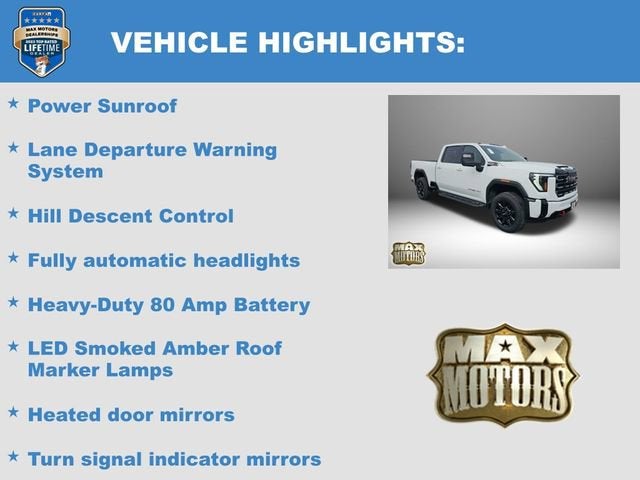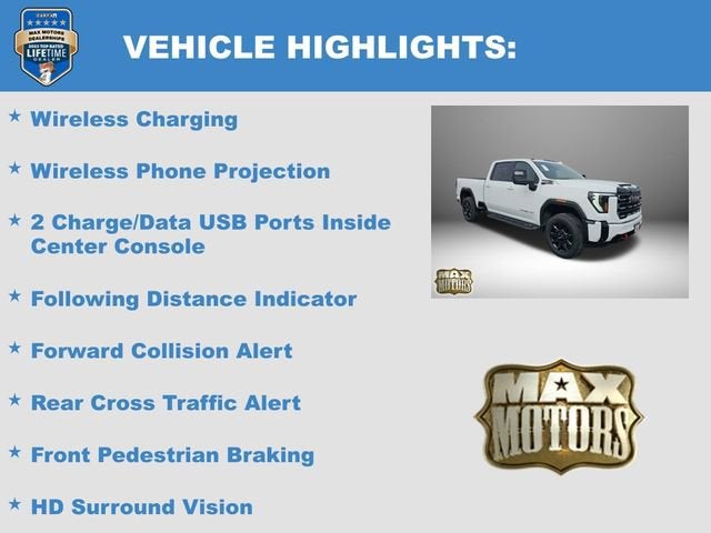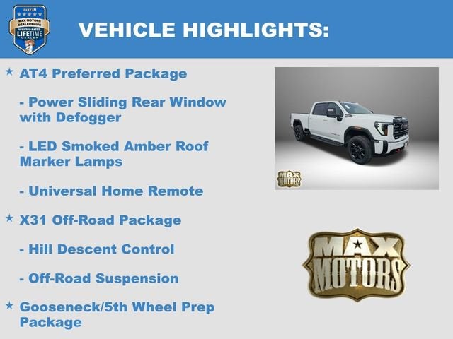 Summit White 2026 GMC Sierra 2500HD AT44D Crew Cab AT4 4WD Duramax 6.6L V8 Turbodiesel10-Speed Automatic, 4WD, Jet Black w/Kalahari Accents w/Perforated Leather-Appointed Front Seat Trim, 2 Charge/Data USB Ports Inside Center Console, Apple CarPlay/Android Auto, AT4 Preferred Package, Bose Premium 7-Speaker Sound System, Following Distance Indicator, Forward Collision Alert, Front Pedestrian Braking, Fully automatic headlights, Gooseneck/5th Wheel Prep Package, HD Surround Vision, Heated 2nd Row Outboard Seats, Heated door mirrors, Heated steering wheel, Heavy-Duty 80 Amp Battery, Hill Descent Control, Lane Departure Warning System, LED Smoked Amber Roof Marker Lamps, Off-Road Suspension, Power Sunroof, Push Button Start, Rear Cross Traffic Alert, Remote keyless entry, Remote Vehicle Starter System, Steering Wheel Audio Controls, Steering wheel mounted audio controls, Turn signal indicator mirrors, Universal Home Remote, Variably intermittent wipers, Wheels: 20 High Gloss Black 8 Spokes Aluminum, Wireless Charging, Wireless Phone Projection, X31 Off-Road Package.At Max Motors, our mission is simple: to provide every customer with a honest, transparent, and rewarding automotive experience. For 19 years as a family-owned business, we build strong customer relationships that go beyond a sale. Buying a vehicle is significant, and we ensure the process is smooth and straightforward.