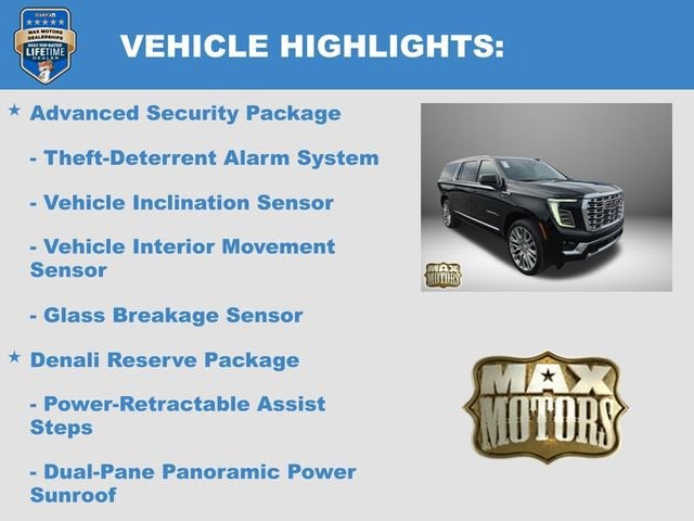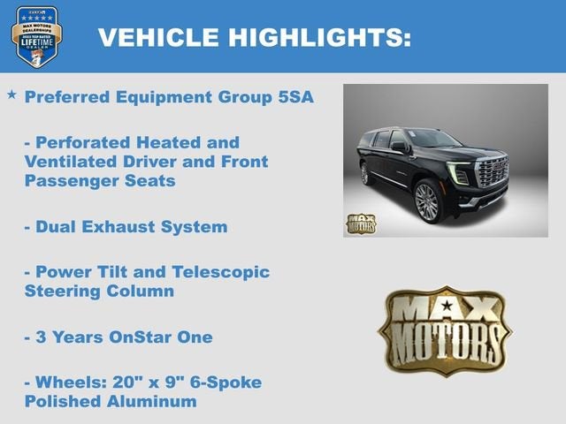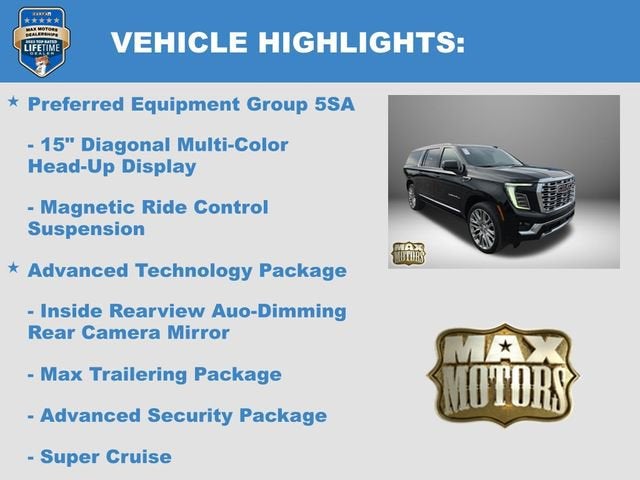 SUPER CRUISE, 4WD, 15 Diagonal Multi-Color Head-Up Display, 3 Years OnStar One, 3rd Row All-Weather Floor Liners, 4-Way Power Driver Lumbar Seat Adjuster, 4-Way Power Front Passenger Lumbar Seat Adjuster, Advanced Security Package, Advanced Technology Package, All-Weather Cargo Mat, Automatic temperature control, AutoSense Hands-Free Power Liftgate, Blind Zone Steering Assist with Trailering, Bose 10-Speaker Surround with CenterPoint, Bright Front and Rear Door Sill Plates, Denali Reserve Package, Driver Attention Assist, Dual Exhaust System, Dual-Pane Panoramic Power Sunroof, Emergency communication system: OnStar and GMC connected services capable, Enhanced Trailering Technology Package, Extra Capacity Cooling System, First and Second Rows Premium Floor Liners, Floor Liner Package, Front dual zone A/C, Fully automatic headlights, Galvano Bodyside Moldings, Glass Breakage Sensor, Heated door mirrors, Heated Driver and Front Passenger Seats, Heated steering wheel, Hill Descent Control, Hitch View, Illuminated entry, Inside Rearview Auo-Dimming Rear Camera Mirror, Integrated Trailer Brake Controller, Magnetic Ride Control Suspension, Max Trailering Package, Navigation system: GMC Connected Navigation, Perforated Heated and Ventilated Driver and Front Passenger Seats, Power Liftgate, Power Release 2nd Row Bucket Seats, Power Tilt and Telescopic Steering Column, Power-Retractable Assist Steps, Preferred Equipment Group 5SA, Rear Seat Media System, Remote keyless entry, Smart Trailer Integration Indicator, Steering wheel memory, Steering wheel mounted audio controls, Super Cruise, Theft-Deterrent Alarm System, Trailer Camera Provisions, Trailering Assist Guidelines, Turn signal indicator mirrors, Variably intermittent wipers, Vehicle Inclination Sensor, Vehicle Interior Movement Sensor, Wheels: 20 x 9 6-Spoke Polished Aluminum, Wired Auxiliary Trailer Camera.