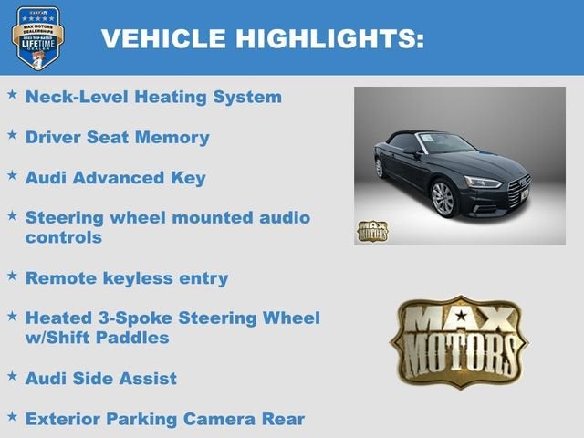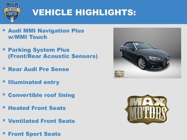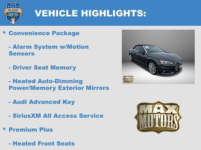 quattro, Black w/Leather Seating Surfaces, 12.3 LCD Display Audi Virtual Cockpit, Alarm System w/Motion Sensors, Audi Advanced Key, Audi MMI Navigation Plus w/MMI Touch, Audi Side Assist, Bang & Olufsen Sound System w/3D Sound, Convenience Package, Convertible roof lining, Driver Seat Memory, Exterior Parking Camera Rear, Front Sport Seats, Full LED Headlights, Heated 3-Spoke Steering Wheel w/Shift Paddles, Heated Auto-Dimming Power Ext Mirrors w/Memory, Heated Auto-Dimming Power/Memory Exterior Mirrors, Heated Front Seats, High intensity discharge headlights: Xenon plus, Illuminated entry, Luxury Package, Navigation Package, Neck-Level Heating System, Parking System Plus (Front/Rear Acoustic Sensors), Premium Plus, Rear Audi Pre Sense, Remote keyless entry, SiriusXM All Access Service, Steering wheel mounted audio controls, Variably intermittent wipers, Ventilated Front Seats, Wheels: 18 x 8.5 10-Spoke-Dynamic-Design.