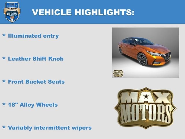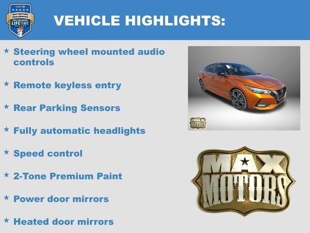 Recent Arrival!CARFAX One-Owner. Clean CARFAX.Monarch Orange/Super Black 2021 Nissan Sentra SR4D Sedan SR FWD 2.0L DOHC28/37 City/Highway MPG 28/37 City/Highway MPGCVT with Xtronic, Charcoal w/Upgraded Cloth Seat Trim, 18 Alloy Wheels, 2-Tone Premium Paint, Front Bucket Seats, Fully automatic headlights, Heated door mirrors, Illuminated entry, Leather Shift Knob, Power door mirrors, Rear Parking Sensors, Remote keyless entry, Speed control, Steering wheel mounted audio controls, Variably intermittent wipers.Odometer is 9436 miles below market average!Awards:* JD Power Automotive Performance, Execution and Layout (APEAL) StudyAt Max Motors, our mission is simple: to provide every customer with a honest, transparent, and rewarding automotive experience. For 19 years as a family-owned business, we build strong customer relationships that go beyond a sale. Buying a vehicle is significant, and we ensure the process is smooth and straightforward.