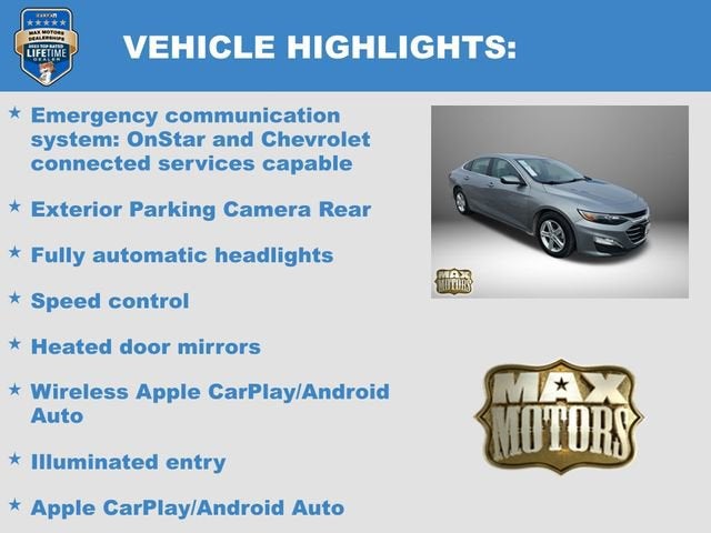 Sterling Gray Metallic 2023 Chevrolet Malibu LT 1LT4D Sedan LT 1LT FWD 1.5L DOHC27/35 City/Highway MPG 27/35 City/Highway MPGGray Cloth, 6-Speaker Audio System Feature, Alloy wheels, Apple CarPlay/Android Auto, Emergency communication system: OnStar and Chevrolet connected services capable, Exterior Parking Camera Rear, Fully automatic headlights, Heated door mirrors, Heated Driver & Front Passenger Seats, Illuminated entry, Preferred Equipment Group 1LT, Premium audio system: Chevrolet Infotainment 3 Plus, Radio: Chevrolet Infotainment 3 System, Remote keyless entry, SiriusXM Radio, Speed control, Steering wheel mounted audio controls, Variably intermittent wipers, Wireless Apple CarPlay/Android Auto.Odometer is 5883 miles below market average!At Max Motors, our mission is simple: to provide every customer with a honest, transparent, and rewarding automotive experience. For 19 years as a family-owned business, we build strong customer relationships that go beyond a sale. Buying a vehicle is significant, and we ensure the process is smooth and straightforward.