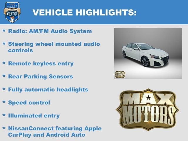 CVT with Xtronic, 17 Machined Alloy Wheels, Front Bucket Seats, Fully automatic headlights, Illuminated entry, NissanConnect featuring Apple CarPlay and Android Auto, Radio: AM/FM Audio System, Rear Parking Sensors, Remote keyless entry, Speed control, Steering wheel mounted audio controls, Variably intermittent wipers.