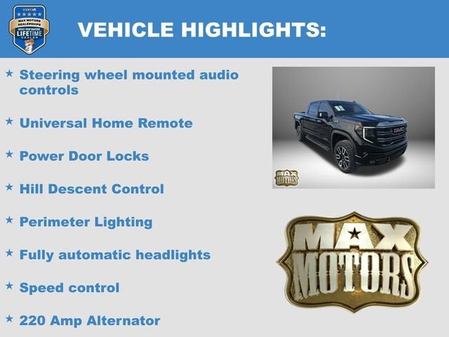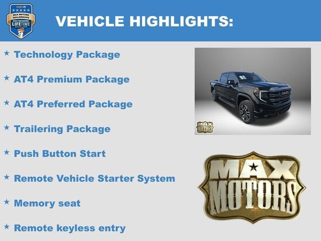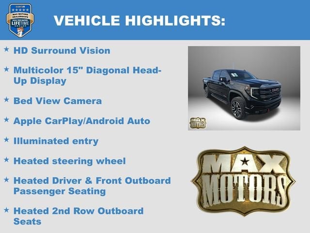 CARFAX One-Owner. Clean CARFAX.Onyx Black 2024 GMC Sierra 1500 AT44D Crew Cab AT4 4WD EcoTec3 6.2L V814/17 City/Highway MPG10-Speed Automatic, 4WD, Jet Black w/Kalahari Accents w/Perforated Front Leather Seat Trim, 220 Amp Alternator, Apple CarPlay/Android Auto, AT4 Preferred Package, AT4 Premium Package, Bed View Camera, Fully automatic headlights, HD Surround Vision, Heated 2nd Row Outboard Seats, Heated Driver & Front Outboard Passenger Seating, Heated steering wheel, Hill Descent Control, Hitch Guidance, Hitch View, Illuminated entry, IntelliBeam Automatic High Beam On/Off, LED Cargo Area Lighting, Memory seat, Multicolor 15 Diagonal Head-Up Display, Off-Road High Clearance Step (LPO), Perimeter Lighting, Power Door Locks, Power Sliding Rear Window w/Rear Defogger, Push Button Start, Rear Camera Mirror, Red Recovery Hooks, Remote keyless entry, Remote Vehicle Starter System, Speed control, Spray-On Pickup Bedliner w/AT4 Logo, Steering wheel mounted audio controls, Technology Package, Trailering Package, Universal Home Remote, Ventilated Driver & Front Passenger Seats, Wheels: 20 x 9 Machined Aluminum, Wireless Apple CarPlay/Wireless Android Auto, Wireless Charging.Odometer is 1799 miles below market average!At Max Motors, our mission is simple: to provide every customer with a honest, transparent, and rewarding automotive experience. For 19 years as a family-owned business, we build strong customer relationships that go beyond a sale. Buying a vehicle is significant, and we ensure the process is smooth and straightforward.