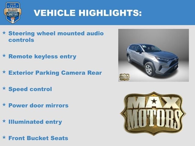 CARFAX One-Owner. Clean CARFAX.Silver Sky Metallic 2024 Toyota RAV4 LE4D Sport Utility LE AWD 2.5L 4-Cylinder DOHC Dual VVT-i27/34 City/Highway MPG 27/34 City/Highway MPGAWD, Black w/Fabric Seat Trim, Exterior Parking Camera Rear, Front Bucket Seats, Illuminated entry, Power door mirrors, Remote keyless entry, Speed control, Steering wheel mounted audio controls.At Max Motors, our mission is simple: to provide every customer with a honest, transparent, and rewarding automotive experience. For 19 years as a family-owned business, we build strong customer relationships that go beyond a sale. Buying a vehicle is significant, and we ensure the process is smooth and straightforward.